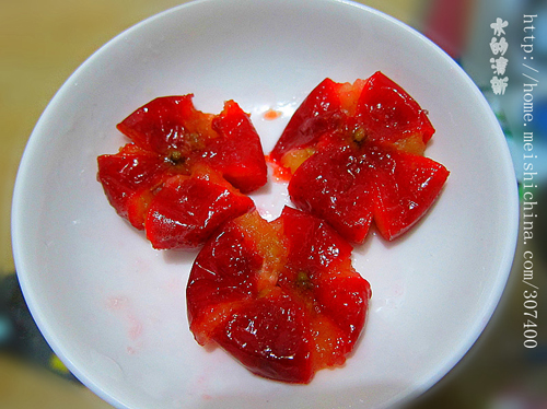 6、取出的山楂用筷子轻压挤出花形即可食用。