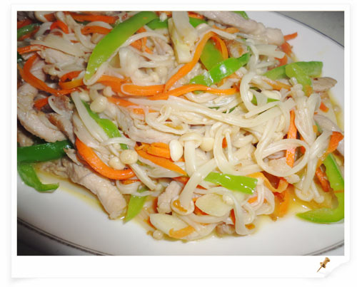 及以下步骤:然后放入大蒜和胡萝卜炒香 再加入尖椒翻炒 最后加入金针菇翻炒。 锅中加入少许白糖、食盐、鸡精调味,才变软后盛出即可。(出锅前别忘了加入少许香醋提味哦) 尖椒和大蒜切成丝备用 锅中放入少许花生油,油热后将腌制好的猪肉放入炒熟 然后放入大蒜和胡萝卜炒香 再加入尖椒翻炒 最后加入金针菇翻炒。 锅中加入少许白糖、食盐、鸡精调味,才变软后盛出即可。(出锅前别忘了加入少许香醋提味哦)