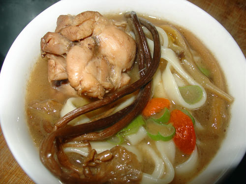 在饭店吃的小鸡山蘑面很好吃回家自己尝试做一下,面条一般主要看汤汁,自己动手煮汤,味道不错还有营养卫生!