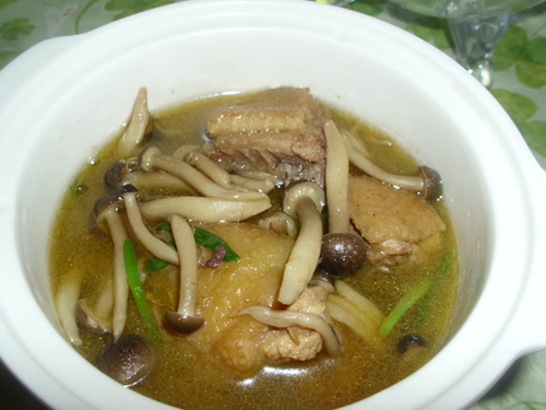 真姬菇hypsizygus marmoreus (peck) h.e.bigelow又名玉蕈、斑玉蕈,属担子菌亚门、层菌纲、伞菌目、白蘑科、玉蕈属。真姬菇外形美观,质地脆嫩,味道鲜鲜,具有海蟹味,在日本称之为蟹味菇、海鲜菇。目前栽培的有浅灰色和纯白色两个品系,白色品系又称白玉菇、玉龙菇,深受市场欢迎。 该菇营养丰富,据分析每100克鲜菇中含粗蛋白3.22克、粗脂肪0.22克、粗纤维1.68克、碳水化合物4.56克、灰分1.32克,磷、铁、锌、钙、钾、钠的含量非常丰富,维生素b1、b2、b6、c的含量也较一般菇类高,是一种非常珍贵的食用菌。 鸡腿肉肉蛋白质的含量比例较高,种类多,而且消化率高,很容易被人体吸收利用,有增强体力、强壮身体的作用.鸡肉含有对人体生长发育有重要作用的磷脂类,是中国人膳食结构中脂肪和磷脂的重要来源之一.鸡肉对营养不良、畏寒怕冷、乏力疲劳、月经不调、贫血、虚弱等有很好的鸡腿食疗作用.祖国医学认为,鸡肉有温中益气、补虚填精、健脾胃、活血脉、强筋骨的功效。