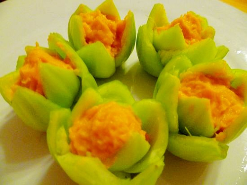 及以下步骤:南瓜削皮洗净。 蒸熟制成南瓜泥。 南瓜削皮洗净。 蒸熟制成南瓜泥。 南瓜削皮洗净。 蒸熟制成南瓜泥。 南瓜泥加入奶粉、炼乳、盐、蜂蜜、糖搅拌均匀。 油菜洗净切掉叶子,修成花朵形状,中间部分挖掉。 将搅拌好的南瓜泥小心的放到油菜小花中心。 摆盘即可。
