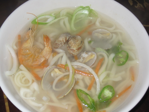 及以下步骤:面条煮开了就可以了 可以点几滴香油 放一点鸡精提味 来一张特写 蛤蜊洗干净 材料切成丝 锅里凉水,放入蛤蜊,虾 切好的材料放进去一半 成袋的面条 两袋就是两人份 水开之后放面条 面条煮开了就可以了 可以点几滴香油 放一点鸡精提味 来一张特写