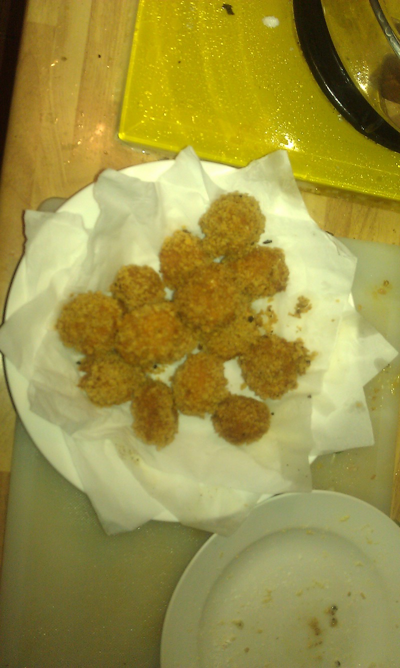 2、初來此地,才知需要圖片詳細配合,做這個菜時沒有照這麼多,見諒 見諒。攪拌時用手順一方向,用力,可摔打。用手擠出丸子,用沾少許油的金屬勺刮下,沾滿麵包糠備用。