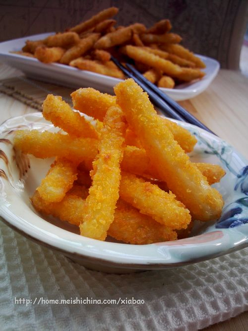 及以下步骤:鸡蛋一个打散。 把沾过面粉的地瓜条再裹一层鸡蛋液。 均匀沾上面包糠,这个袋装的面包糠是金黄色的,所以炸出来的颜色也特别的漂亮。 沾好后也抖掉多余的面包糠。 锅中倒适量油,油温加至七层左右热,下入地瓜条炸两分钟。 把地瓜条捞出来,继续加热油温,再次回锅复炸,逼出多余的油分,这时候只需十秒钟即可捞出,不然油温过高颜色会很快变焦黄,口感过硬,影响美观和口感。 均匀沾上面包糠,这个袋装的面包糠是金黄色的,所以炸出来的颜色也特别的漂亮。 沾好后也抖掉多余的面包糠。 锅中倒适量油,油温加至七层左右热,下入地瓜条炸两分钟。 把地瓜条捞出来,继续加热油温,再次回锅复炸,逼出多余的油分,这时候只需十秒钟即可捞出,不然油温过高颜色会很快变焦黄,口感过硬,影响美观和口感。