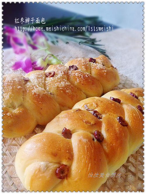 及以下步骤:面蒸发2.5倍以上放入大枣碎揉至排好气,拓展10-20分钟。 然后搓成长条。 面团切成9段。 然后揉圆稍微醒发一下,10分钟左右。 一个辫子用三个,然后搓成长条。 把三个长条变成花辫子。 编好的辫子就是这样的了。 然后放入铺了锡纸或者油纸的烤盘,在上面装点了一些枣片进行最后的醒发需要30-40分钟。 醒发好的辫子面包刷上蛋液,我 还在其中的两个上面撒了一些砂糖,这个喜欢可以撒也可以不撒。 做好的面包放在烤网上稍微凉一些吃口感更好,剩下的可以放入保鲜袋保存。