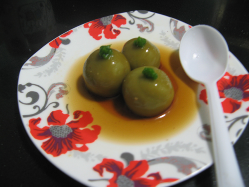 4、锅里放水烧开后放进菠菜糯米团,煮至浮起,盛出,将烧好融化的红糖浆淋在上面。最后就在面团上加上自己喜欢的配料。花生或芝麻碎。我这次加了菠菜蓉。