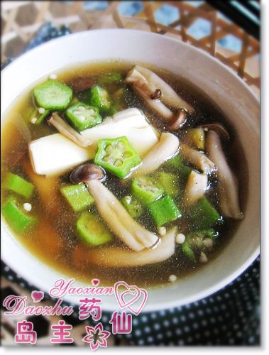 及以下步骤:把蟹味菇洗净,豆腐切成小块。 把秋葵洗净,去头去尾切成小片备用,姜切成丝。 把蟹味菇洗净,豆腐切成小块。 把秋葵洗净,去头去尾切成小片备用,姜切成丝。 把蟹味菇洗净,豆腐切成小块。 把秋葵洗净,去头去尾切成小片备用,姜切成丝。 把蟹味菇洗净,豆腐切成小块。 在锅里放进姜丝和水烧开,依次加入蟹味菇及秋葵。 待汤煮开后,加入适量大酱及调味料,搅匀。 最后加入豆腐稍微煮一下即可。