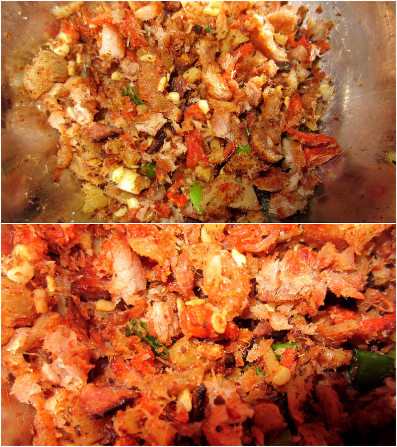 及以下步骤:将大蒜不剥皮,姜,小米辣放在炒锅上不加油,烘熟,如果是烧烤的话可以烤熟,烤熟后姜蒜小米辣都薄皮,剁碎。 将腌好的肉挂起来放在通风室外不易坏的地方晾晒。 冬天4天以后基本就可以了,多晒也没有关系。 夏天太阳烈的时候晒三四个小时,表皮无水分,有点干硬就可以了,或者可以用火来烘烤,不要烤熟。 将大蒜不剥皮,姜,小米辣放在炒锅上不加油,烘熟,如果是烧烤的话可以烤熟,烤熟后姜蒜小米辣都薄皮,剁碎。 将腌好的肉挂起来放在通风室外不易坏的地方晾晒。 冬天4天以后基本就可以了,多晒也没有关系。 夏天太阳烈的时候晒三四个小时,表皮无水分,有点干硬就可以了,或者可以用火来烘烤,不要烤熟。 将大蒜不剥皮,姜,小米辣放在炒锅上不加油,烘熟,如果是烧烤的话可以烤熟,烤熟后姜蒜小米辣都薄皮,剁碎。 因为是把它当成小咸菜来吃, 我晾晒的这一块的大小跟银行卡接近,每次选三块,搭配前面提到的调料数量即可。 小米辣自己随意,我买的实在太辣一颗都辣的够呛~~ 将肉用适量的盐味精擦在一厘米厚的肉片上腌制10分钟左右, 盐不要放太多,调味就可以,不是为了做的特别咸。 将腌好的肉挂起来放在通风室外不易坏的地方晾晒。 冬天4天以后基本就可以了,多晒也没有关系。 夏天太阳烈的时候晒三四个小时,表皮无水分,有点干硬就可以了,或者可以用火来烘烤,不要烤熟。 将大蒜不剥皮,姜,小米辣放在炒锅上不加油,烘熟,如果是烧烤的话可以烤熟,烤熟后姜蒜小米辣都薄皮,剁碎。 接下来将肉放在油锅里小火炸,炸熟即可不要炸太久。捞出来待凉,用刀背拍肉,拍松。拍出肉丝后用手撕成小块或用刀剁成末,混入调料即可。盐和味精可根据自己口味加。