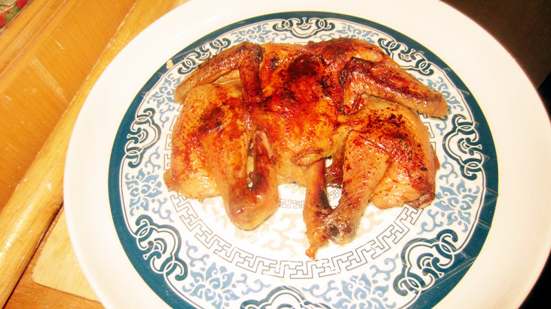 及以下步骤:烤的时200度预热 之后170上火先好没有皮的一面。烤熟之后反过来烤皮面。反过来刷一下糖和酱油混合的液体,等皮成型不生了再刷一次上色,直到烤熟就可以了。一共烤40分钟。自己烤的时候随时观察一点,每个人的烤箱火候都不同。我就有点烤焦了。 将鸡从脖子开始沿着脊椎剪开,到屁股,把整个胸膛打开掏空洗干净。将腔骨用捡到取出。只剩下鸡翅与鸡腿的骨头。 切掉屁股。脊椎可以从屁股根剪掉,也可将洋葱或调料放入肚子内用牙签固定烤。 姜一块 大蒜 小米辣剁碎 加入盐味精胡椒加点食用油调成糊。 糖与酱油混合。待用 将鸡从脖子开始沿着脊椎剪开,到屁股,把整个胸膛打开掏空洗干净。将腔骨用捡到取出。只剩下鸡翅与鸡腿的骨头。 切掉屁股。脊椎可以从屁股根剪掉,也可将洋葱或调料放入肚子内用牙签固定烤。 这次我是把脊椎与脖子剪掉,与腔骨煮了鸡汤。。 将收拾好的鸡用热水烫一下,收紧皮没有褶皱。用姜涂抹皮部。再把之前调好的调料糊在整只鸡上涂抹均匀,把葱切片铺在盘底,没有皮的面向下放在葱上方面入味。腌制12小时以上。 将收拾好的鸡用热水烫一下,收紧皮没有褶皱。用姜涂抹皮部。再把之前调好的调料糊在整只鸡上涂抹均匀,把葱切片铺在盘底,没有皮的面向下放在葱上方面入味。腌制12小时以上。 烤的时200度预热 之后170上火先好没有皮的一面。烤熟之后反过来烤皮面。反过来刷一下糖和酱油混合的液体,等皮成型不生了再刷一次上色,直到烤熟就可以了。一共烤40分钟。自己烤的时候随时观察一点,每个人的烤箱火候都不同。我就有点烤焦了。