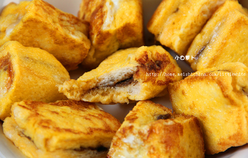 6、将粘好的面包片放到蛋液中包裹均匀,放到平底锅中煎至六面金黄即可。