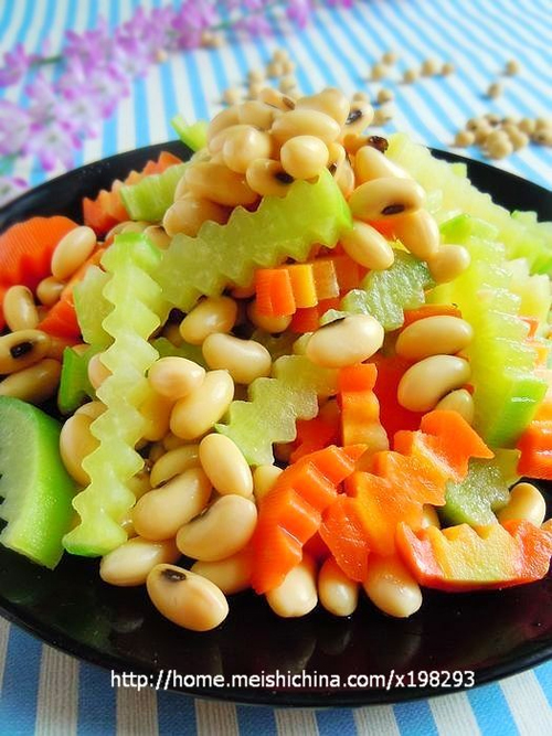 及以下步骤:用沸水焯一下萝卜条至断生,过凉水备用。 将煮好的黄豆凉凉后沥干水分和萝卜条混合在一起。 倒进去两勺香醋适量食盐。 加一勺香油和一勺生抽搅拌均匀即可。 锅开后,转中火揭开锅盖煮30分钟黄豆就煮好了。 将胡萝卜和水果萝卜用花刀切成长条。 用沸水焯一下萝卜条至断生,过凉水备用。 将煮好的黄豆凉凉后沥干水分和萝卜条混合在一起。 倒进去两勺香醋适量食盐。 加一勺香油和一勺生抽搅拌均匀即可。