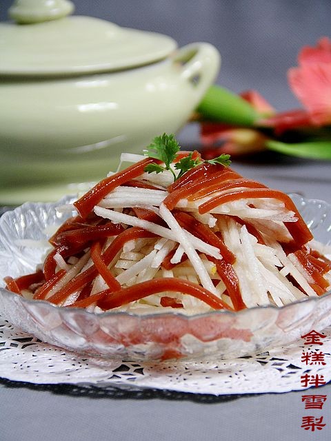 及以下步骤:碗中放少许盐,然后倒入适量凉开水或矿泉水备用。 把雪花梨削皮切成丝,梨丝切的不要太细大约有火柴棍粗细即可。 碗中放少许盐,然后倒入适量凉开水或矿泉水备用。 把雪花梨削皮切成丝,梨丝切的不要太细大约有火柴棍粗细即可。 碗中放少许盐,然后倒入适量凉开水或矿泉水备用。 把雪花梨削皮切成丝,梨丝切的不要太细大约有火柴棍粗细即可。 切好后放入淡盐水盆里浸泡三五秒钟捞出,这样梨丝不易变色。 金糕切丝,丝的粗细和梨丝大致相同即可。 然后也放入淡盐水盆中稍微过一下去掉粘性,这样便于拌食的时候不易粘连。 把捞出的梨丝和金糕丝沥净水份,然后均匀的撒入少许白糖码盘即可。