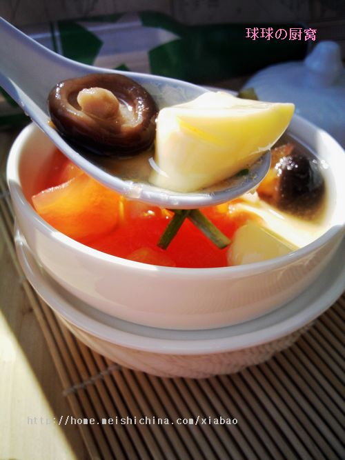 一款清淡的汤送给大家!这道汤中番茄和香菇起的作用比较大,番茄的酸甜汁做蔬菜汤底一直是很不错的选择,香菇也有淡淡的香。另外日本豆腐爽滑,干贝鲜甜,是个不错的解腻汤哦!个人觉得番茄和香菇要先用油滑炒一下出红油再下水,这样的汤比较好喝。