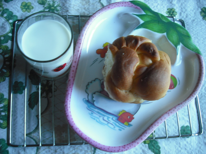 及以下步骤:忘了按照方子里说的要用手指蘸点干面粉 插在中间检验一下发酵的程度了,兴奋之余就在发好的面上抓了一下留下几个手指印,这时才想起应该做的那个动作。其实那个中间的手指印是后补的呵呵! 将盆里的面团取出排出空气,然后揪成大小一致的六个剂子,将剂子搓成长条上劲,再将两头捏在一起。 像做麻花一样把搓好的面条卷在一起 把卷好的面条的两头塞在下边从中间绕上来即可。 做好的面包坯子。 将做好的面包坯子放在铺好锡纸的烤盘里。呵呵由于不是老手,做成的面包坯子形态各异, 盖上保鲜膜等待再次发酵。 盖上保鲜膜在次醒发为了保持湿度和温度大约醒发了20多分钟,见体积长大就ok了,将醒发好的面包放入烤箱,中层上下火180度,30分钟,拷到20分钟左右,取出将室温融化的黄油用毛刷刷在面包上,上面盖上锡纸,放入烤箱继续烘烤 金黄色,又香甜的老面包出炉了,我的处女作成功了! 赶紧展示一下,炫耀一下,拍照留念。 吃着自己动手做的老面包,回忆起了小的时候,特想那个味道。甜甜略带一点酸真是美极了。