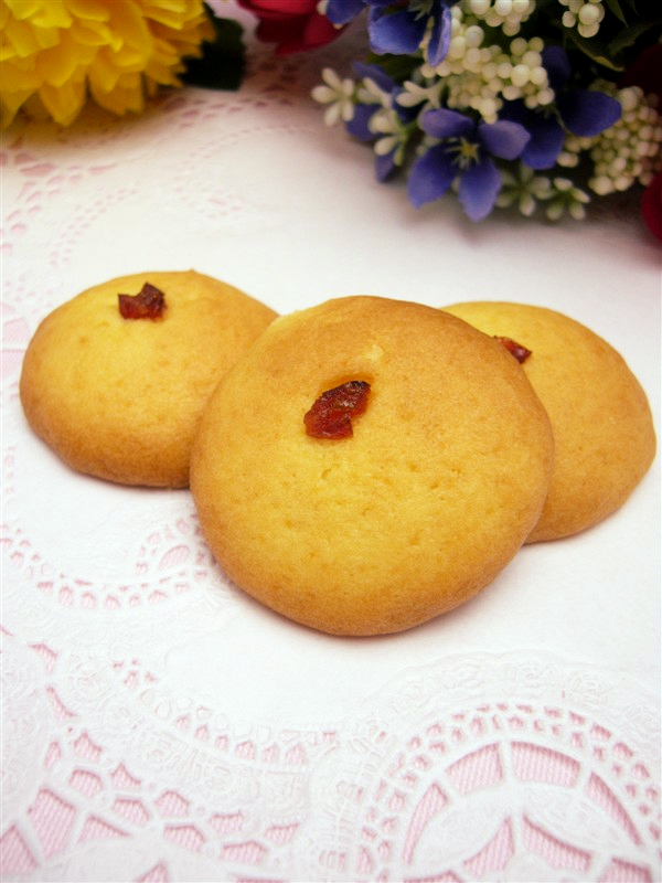 及以下步骤:7. 烤箱170度预热.挤成2厘米大小到烤盘上, 中间要有1.5厘米左右的空隙--- 8. 饼干生胚上放上喜欢的果铺--- 烤箱170度,烤10-15分钟,喜欢颜色重,烤好后再闷3-5分. 1. 黄油,切成1厘米的小块,放在室温下软化---- 2. 黄油搅拌到略微发白-- 3. 加入,白糖,鸡蛋,牛奶充分搅拌---(想多烤些饼干的话,糖,牛奶和鸡蛋要分开放入,鸡蛋要分3次放入为好) 4. 放入低粉和泡打粉搅拌均匀---- (想要多烤些的同学,低粉和泡打粉先搅拌匀,过筛再放入) 5. 专用塑料袋剪口,放入挤口--- 6. 塑料袋放入杯中,再把面糊倒入塑料袋中---- 7. 烤箱170度预热.挤成2厘米大小到烤盘上, 中间要有1.5厘米左右的空隙--- 8. 饼干生胚上放上喜欢的果铺--- 烤箱170度,烤10-15分钟,喜欢颜色重,烤好后再闷3-5分.