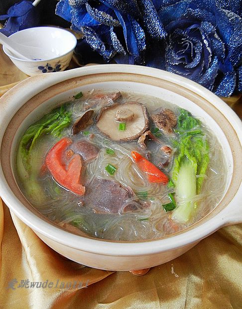 及以下步骤:放下粉丝中火煮开。 放下青菜心煮开,捞出葱结。 加盐,鸡精,鲜抽,胡椒粉,葱花调味即可。 粉丝用温水泡好。 锅里油热,放姜片,鸭内脏煸炒。 取砂锅,放适量清水,放下鸭内脏。 放2片西红柿,香菇,葱结,料酒,大火煮开,小火20分钟。 放下粉丝中火煮开。 放下青菜心煮开,捞出葱结。 加盐,鸡精,鲜抽,胡椒粉,葱花调味即可。