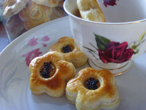 孔内点缀一些白芝麻会更好看,更像桃花些,可惜家里只有黑的了,或是填入果酱也是很好看滴。