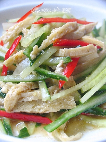 1、水面筋、红辣椒和黄瓜分别切粗丝。