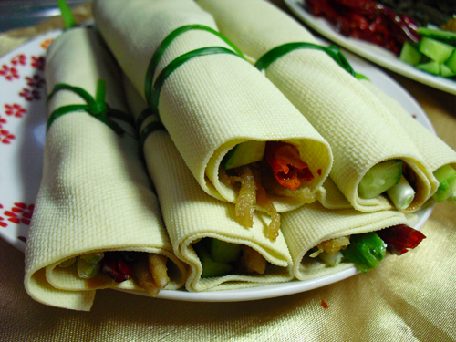 及以下步骤:按照个人的口味加料。 简单一点的,蒜苗、黄瓜、大酱,让人想起煎饼卷大葱! 卷成卷后,用烫熟的韭菜绑结,即可食用。 红辣椒切段,用油炸香炸脆! 韭菜放入开水中烫软。 肉切长条加入鸡蛋和淀粉,放入油锅中炸熟。 黄瓜切长条,将准备好的材料摆放在盘中。 按照个人的口味加料。 简单一点的,蒜苗、黄瓜、大酱,让人想起煎饼卷大葱! 卷成卷后,用烫熟的韭菜绑结,即可食用。