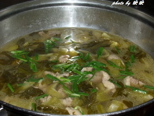 及以下步骤:焖至水分干时加入酸菜大火翻炒。 加入适量水,加盖烧开。 烧开后转移到汤锅里继续烧几分钟。 汤锅里加入椒盐和盐调味,最后加入葱段即可。 期间洗好西洋菜。(个人喜好边吃边烫青菜吃,就当吃火锅了) 边加热边吃,还烫西洋菜吃,很不错哦! 烧开后转移到汤锅里继续烧几分钟。 汤锅里加入椒盐和盐调味,最后加入葱段即可。 期间洗好西洋菜。(个人喜好边吃边烫青菜吃,就当吃火锅了) 边加热边吃,还烫西洋菜吃,很不错哦!