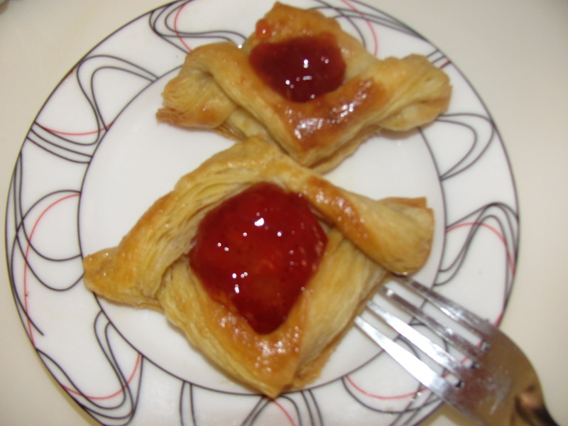 及以下步骤:刷蛋液,烤箱上下火180度20分钟就烤好了。 当中放上草莓酱就ok了... 酥皮1张备用。 把酥皮切成方形。 对折成三角形,用刀顺边上切开,顶端不要切断。 把切好的皮展开。 把一边折过去。 另一面从上面折过。 刷蛋液,烤箱上下火180度20分钟就烤好了。 当中放上草莓酱就ok了...