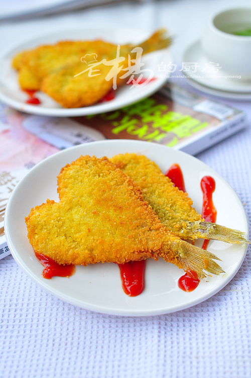 及以下步骤:入油锅炸金黄,捞出复炸一次吐油即可。 吃的时候趁热配番茄酱超级好吃。 原料图。 黄鱼用刀把脊骨割开。用剪刀修剪掉脊骨。 把鱼最大限度的修剪出心形弧度。修好后洗净。边角碎料也不要扔,也可以炸了吃掉。 全部处理好的鱼用盐,胡椒粉,姜泥腌渍十分钟。面包糠,干淀粉放在干净的盘中,鸡蛋打散。 鱼依次过干淀粉,蛋液,面包糠,做成生坯。 做好的生坯。 入油锅炸金黄,捞出复炸一次吐油即可。 吃的时候趁热配番茄酱超级好吃。