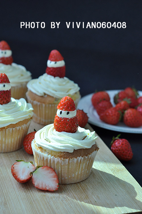 如果嫌做“雪人”造型麻烦 ,可以直接把草莓摆在小蛋糕上装饰。