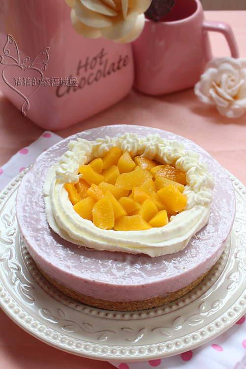 及以下步骤:搅拌至顺滑无颗粒。 放入白糖和蓝莓酱搅拌均匀。 倒入酸奶,搅拌至均匀顺滑。 吉利丁片泡软后隔温水融化。 倒入奶酪糊中搅拌均匀。 把搅拌好的奶酪糊倒入放了饼干底的模具内,放冰箱冷藏4小时以上。 冷藏好的芝士蛋糕脱模。 淡奶油加糖打发。 用淡奶油和黄桃装饰芝士蛋糕表面。 用淡奶油和黄桃装饰芝士蛋糕表面。