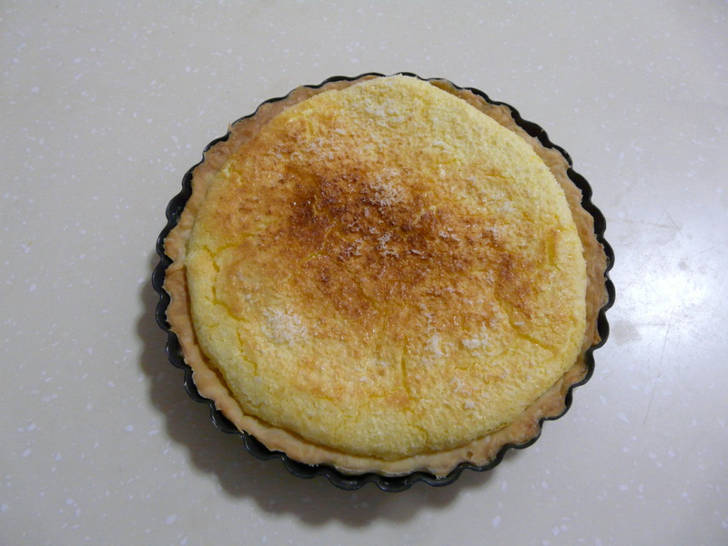 4、把静置好的塔液倒入派盘中,8分满即可。然后再均匀的撒上椰蓉。