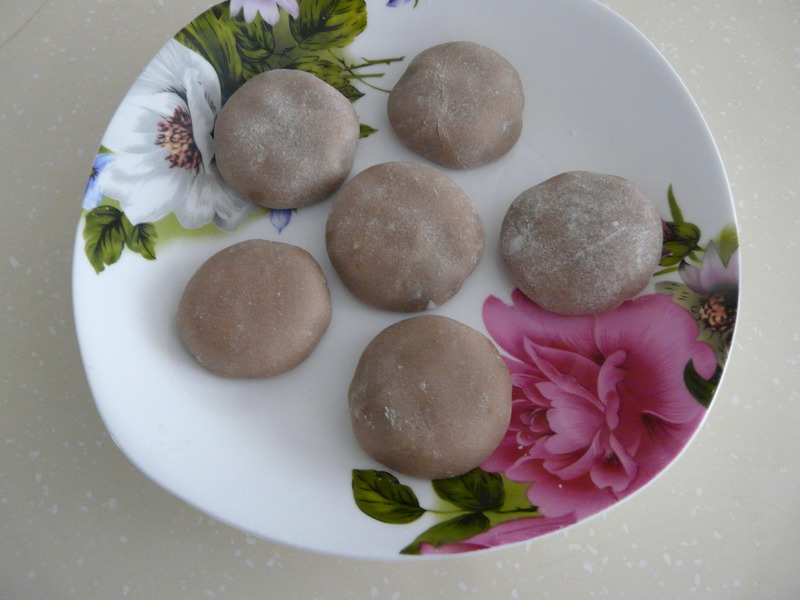 5、把豆沙馅包进皮里。收口朝下,团成圆形,再压扁。凉糕做好了。