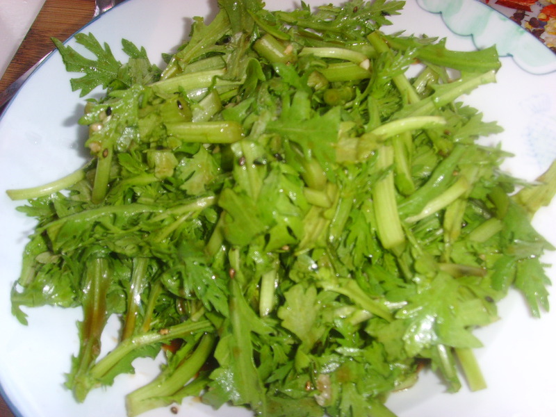 家里请朋友吃饭又剩茼蒿了,呵呵呵,每次朋友来家吃饭都是火锅啊、还有烤肉啊,所以茼蒿总是准备多,总剩,上次做了蒜蓉茼蒿,这次变了一下口味~老醋辣根茼蒿。 刚刚吃完了,味道嘛,有茼蒿的原味~清清淡淡的、有辣根的辣味~一点点、有老醋的酸味加上白糖丝丝的酸酸甜甜,嗯~餐桌上有这么一道爽口菜,真不错。呵呵呵