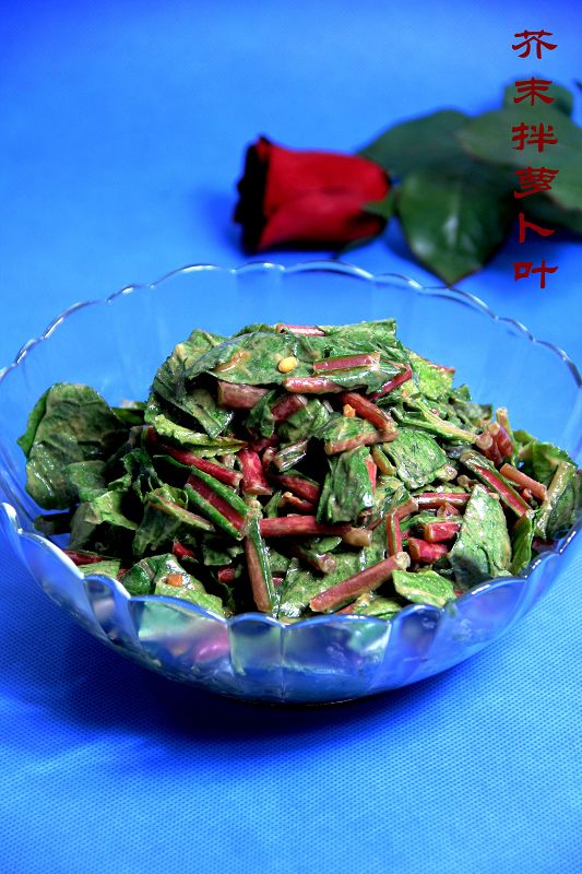 开春后气温开始渐暖,新鲜的应季蔬菜也开始陆续上市。蔬菜最好的营养发挥以生吃为最好,西餐的沙拉就是以生为主,但制作凉拌菜一定要注意卫生,凉拌的蔬果要洗净消毒,否则很容易闹肚子。 刚上市的小萝卜,除了萝卜烧菜或凉拌外,萝卜叶也是很好的食材,其中钾镁钙磷铁,维生素a、c、e含量也极其丰富。俗称的萝卜缨子即萝卜叶和茎,具有开胃、止泻、止痢的作用。民间验方夏季常用干萝卜缨子加油盐作汤,可健胃消食,帮助消化,并能防治肠炎、痢疾等。萝卜于地上土壤中生长,老了开花结子,地下的萝卜自空,湖南称为窖萝卜,可把其全株挖出洗净阴干,用它克治肠炎、痢疾效果良好,这种干制的连萝卜带茎叶放置越陈越好。(清异录》中记载:其家自先世多留带茎萝卜,悬之檐下,有至十余年者;每至夏秋有病痢者,煮水服之,即止。放置愈久者愈妙。因此,这种好东西只要叶子不被虫蛀或腐烂变色就切不可随意丢弃,做道小菜是非常好的。 今天,就用小萝卜的叶,也就是俗称的萝卜缨子凉拌一道小菜,叫做芥末酱拌萝卜叶,说是芥末酱,其实是不太辣的那种西式芥末酱,既有芥末的味道又不会呛鼻子,呵呵!做法如下;
