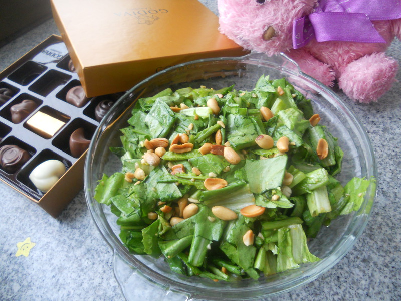 5、油麦菜段、花生放到一起,淋入料汁。