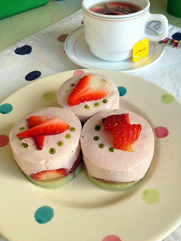 及以下步骤:将鱼胶片于酸奶泥充分搅拌,再把其他的酸奶豆腐泥也拌入,搅拌均匀。 将牛奶、抹茶粉、寒天粉如果中置火上煮,不停搅拌,至沸腾后30秒离火。 静置至冷,待其凝固。 装饰用草莓切成半圆的片。 将模具压入牛奶抹茶冻。 在模具壁上贴上半圆的草莓片。 填入豆腐酸奶泥,入冰箱放置4小时以上即可成型。 取下模具,用草莓和抹茶粉装饰即可。 填入豆腐酸奶泥,入冰箱放置4小时以上即可成型。 取下模具,用草莓和抹茶粉装饰即可。