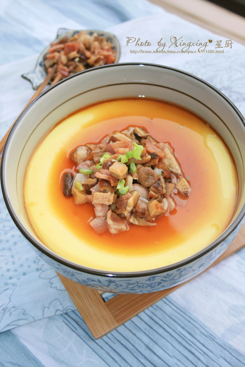 及以下步骤:倒入碗中。包上保鲜膜。 蒸锅开大火烧开,开中火,冒气把碗放入。中火25分钟。第一开中火不容易上蛋羹的表面有所破坏。 准备培根和蘑菇、葱。 培根切块,蘑菇切块。葱切末。 如果炒熟,加入耗油,鸡精,花椒水,生抽。花椒水。炒香。炒熟。 鸡蛋羹蒸好,不要马上揭开保鲜膜,要冷却15分钟。在揭开。 炒好的培根放在鸡蛋羹上,浇上一勺生抽。就可以了。 成品图。 挖起来蛋羹滑嫩。 挖起来蛋羹滑嫩。