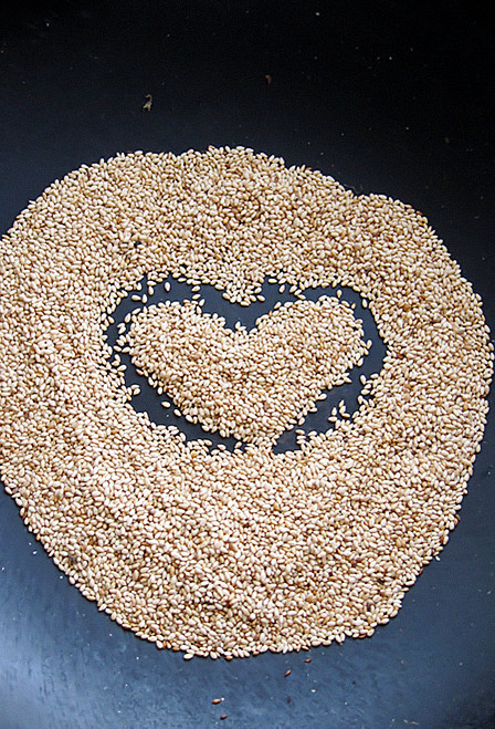 芝麻略微金黄,且闻到香味时,就可以关火了。这时候锅内的余温还可以再细细焙制一下~