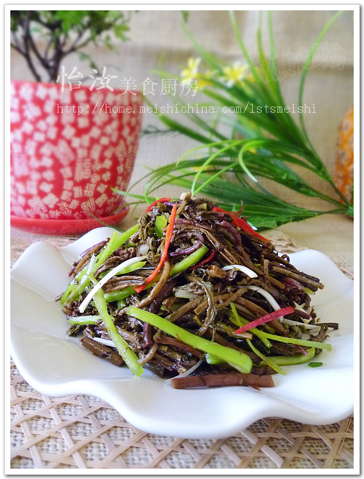蕨菜别名龙头菜、如意菜、乌糯、拳菜,是野菜的一种。蕨菜有几个品种,分布在东北、华北和、四川、云南等地区。在我们老家,有猴腿蕨菜,还有野鸡膀子蕨菜,等等品种,每到端午时节前后满山遍野的蕨菜吸引了各地客商前来收取,很多的都出口韩国和日本了。超市和批发市场都有卖的,一般都是会添加一些色素添加剂什么的,这个是亲属自己腌制送给我的,虽然不如卖的好看,但是味道那是超级好呢。蕨菜鲜嫩细软、余味悠长,且营养价值高,又有多种药用功能,享有山珍之王的美称。也是一种最具保健美容功效的绿色健康蔬菜。据说也是恐龙时代的遗留品种。所烹制的菜肴色泽红润,质地软嫩,清香味浓。可以用来凉拌或者用来炒肉、者炒鸡蛋或者炖肉、做馅都都挺好吃。 一直都想照这个菜,只是一直都是赶上阴天或者晚上,此菜本来不是很好看,所有一直至今才又拍了照。今天怡汝用蕨菜做了最简单也是饭店最长见的一款小菜【凉拌蕨菜】,别说自己拌的,味道非常不错呢,喜欢的朋友不妨自己动手试试看哦! 蕨菜含有维生素c、钾、钙、磷、铁、锰、铜、锌等,它不但营养丰富而且蕨菜根中含有一种高级淀粉,除了一般药用或炒食外,经磨过滤,可以制成蕨粉,也就是我们吃的蕨根粉,目前在饭店里也很叫座的小菜。它可以代替豆粉或藕粉制作麦芽糖、饼干、粉条、凉粉等食品,又可用来酿酒,提取酒精。 蕨菜的营养价值: 1、蕨菜素对细菌有一定的抑制作用,可用于发热不退、肠风热毒、湿疹、疮疡 等病症,具有良好的清热解毒、杀菌清炎之功效; 2、蕨菜的某些有效成分能扩张血管,降低血压; 3、所含粗纤维能促进胃肠蠕动,具有下气通便的作用; 4、蕨菜能清肠排毒,民间常用蕨菜治疗泄泻痢疾及小便淋漓不通,有一定效果; 5、蕨菜可制成粉皮、粉长代粮充饥,有补脾益气,强健机体,增强抗病能力; 6、近年来科学研究表明蕨菜还具有一定的抗癌功效。