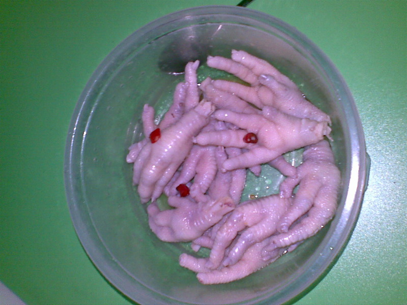 及以下步骤:12只鸡脚,洗净。 指天椒(我只用了其中最少) 12只鸡脚,洗净。 指天椒(我只用了其中最少) 12只鸡脚,洗净。 指天椒(我只用了其中最少) 12只鸡脚,洗净。 指天椒(我只用了其中最少) 鸡脚与水一同入锅,水开后再大火煮13分钟,捞起倒入凉水中开小水冲走表面上的少量油,这样冲一个半小时 倒掉水,调味。油1匙,醋2匙,米酒1匙,盐1匙,葵花籽油1匙,拌均。盖上盖1小时后打开就能吃了。