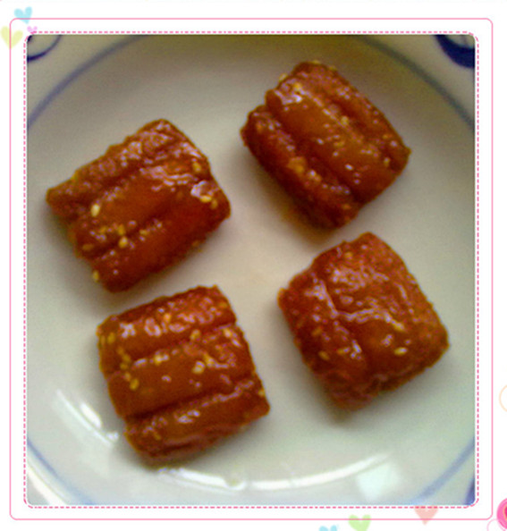 及以下步骤:先切成长条 然后再切成一寸宽的小片,一刀二刀连三刀切。 然后放在60-70度的油温里炸成金黄色捞出即可(灌浆制作:锅内放水、糖、米稀烧烤后(不能拉丝),把炸好的三刀坯放入锅里侵泡12分钟后捞出就成三刀了) 把水油面团擀成薄饼形状 把水油面团把生坯包上,不要全包上只包三分之二。 把面团按扁 把面团擀成长方形厚度为四厘米 先切成长条 然后再切成一寸宽的小片,一刀二刀连三刀切。 然后放在60-70度的油温里炸成金黄色捞出即可(灌浆制作:锅内放水、糖、米稀烧烤后(不能拉丝),把炸好的三刀坯放入锅里侵泡12分钟后捞出就成三刀了)