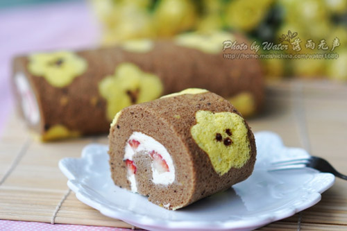继续彩绘蛋糕卷系列,想把蛋糕卷做好做精还需要不断地历练,春天里来花儿朵朵开,这么好的天色应该做个花儿蛋糕卷来映映景,本来是做白底红花的,关健时刻找不着红色素了,只好做可可味的了,不过这样搭配也别有风味!今天用的是奶油草莓馅很好吃耶!
