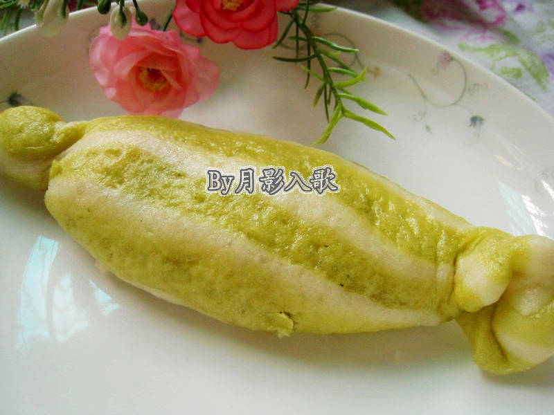 及以下步骤:将两个长方形叠放起来。 然后如图均匀地切成很多长方形。 将所有的长方形叠放起来,就成了一层白色一层绿色啦。. 将所有的长方形叠放起来,就成了一层白色一层绿色啦。 用刀切成一个个的剂子。 切成的剂子,是不是好漂亮? 将剂子擀成大一点儿的长方形,在上面放上多多的肉馅儿。 像包饺子一样把中间捏起来。 两头像糖果一样扭紧,一个漂亮的柳纹糖果包就成功啦。 包好以后放入蒸锅,锅内温水,发酵20分钟,然后蒸20分钟,香喷喷,漂亮亮的包子就出锅了。
