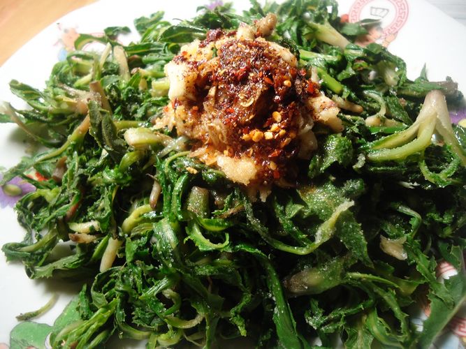 7、把蒜泥和花椒粉放在苦苦菜上