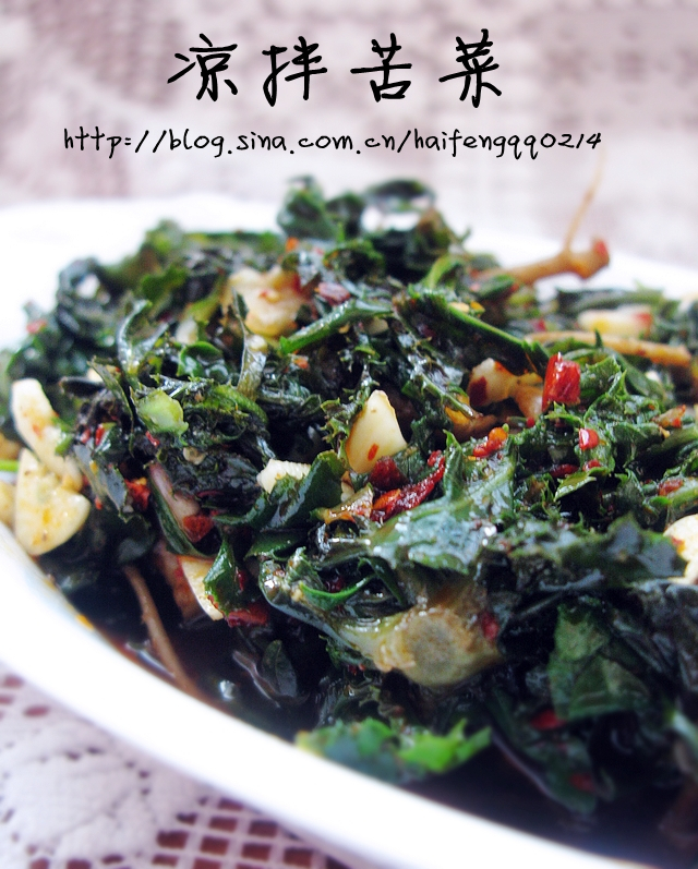 及以下步骤:经过上面的步骤,充分拌均即可,到时,再倒入些陈醋。对于醋来说,拌菜,喜欢陈醋的味道。。够醇厚。 苦菜的根部,最给力,贼拉贼拉的苦,清火,但是,不能多食,伤心肺呀。。 亲手挖的苦菜,去除杂质洗净后,用凉水,先泡1个小时左右,再用开水焯一下,凉水过凉哟。 大蒜,切成碎碎,倒入焯好过凉的苦菜里。 加适量的白糖,介个根据个人的口味喜好呀。 加些生抽,北方称之为酱油。 再加些蚝油,俺,喜欢蚝油的味道,第一,能够使菜品增鲜;第二,特别像这种凉拌菜,能够使调味汁,更好的包裹在野菜上面。。 之后,加些自制的辣椒油。。。油的量一定要比辣椒粒量要多呀,别看倒入的油很多,因为,我都是用橄榄油做为辣椒油的主要的油源呀。。而且,辣椒油里,不光有辣椒,还有花椒,肉桂,当归,肉蔻,芝麻等。。。各种的调料的香味呀。。成本太高,一般不出手的呀。。 经过上面的步骤,充分拌均即可,到时,再倒入些陈醋。对于醋来说,拌菜,喜欢陈醋的味道。。够醇厚。 苦菜的根部,最给力,贼拉贼拉的苦,清火,但是,不能多食,伤心肺呀。。