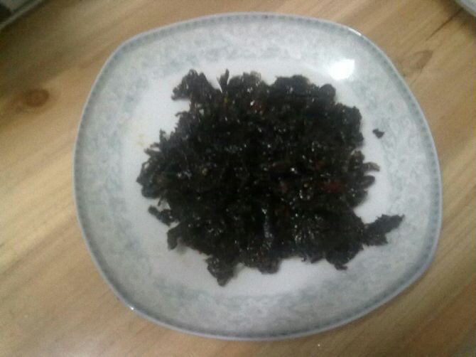 6、按照自己的食用量准备无沙紫菜为了让其脆口,我通常都不洗直接用来拌,不过我想大多人都不能接受,所以建议冲洗后尽量拧干,越干越好