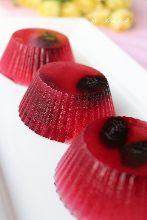 4、布丁模加两个鲜桑椹,将桑椹凉粉水倒入模具,稍凉即可脱模成型!
