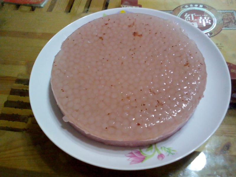 4、搅伴均匀的西米倒入容器中,在常温放凉后放入冰箱1小时,最好不要全部冷却还有少量液体为好.