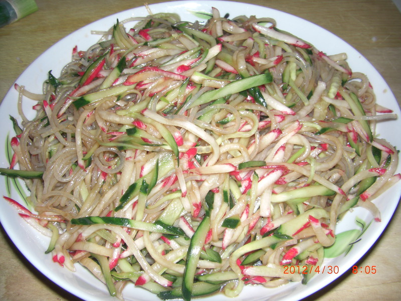 及以下步骤:将原料水萝卜、黄瓜剥洗干净。 粉丝放入水中烫软(以不生芯为准),然后捞出用凉水投凉,控干水分待用。 将原料水萝卜、黄瓜剥洗干净。 粉丝放入水中烫软(以不生芯为准),然后捞出用凉水投凉,控干水分待用。 将原料水萝卜、黄瓜剥洗干净。 粉丝放入水中烫软(以不生芯为准),然后捞出用凉水投凉,控干水分待用。 将原料水萝卜、黄瓜剥洗干净。 粉丝放入水中烫软(以不生芯为准),然后捞出用凉水投凉,控干水分待用。 水萝卜用擦板粗丝模具擦成均匀的丝,黄瓜切成细丝(个人体会:黄瓜不要用擦板擦,因为擦出来的黄瓜丝爱出水,影响口感;水萝卜如果用刀切就一定要切成很细的丝,不然口感太硬,拌出来的菜品也不好吃)。然后把准备好的粉丝放入。 将葱切成4cm左右的长段,然后中间剖开,顺着切成葱丝,放入上述准备好的原料中,加各种调味料(个人体会:醋要多放些,但是酱油一定要少放一点点就好,如果喜欢吃蚝油的口味,可以用蚝油替代酱油)。最后将盘中菜拌匀,装盘上桌,即可食用。