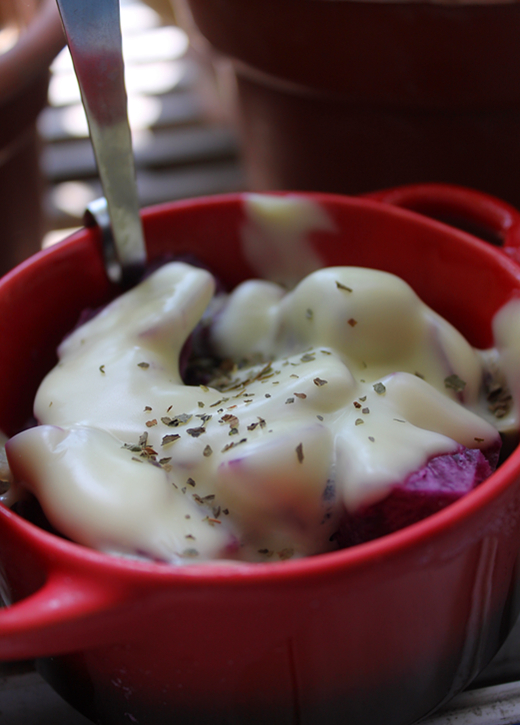 4、这时拿出来的紫薯已经将牛奶吸的差不多了,加上一片芝士,靠紫薯的热气就可以使其软化,如果喜欢更软的话,可以中火20秒。趁热撒上一小撮罗勒叶,点缀也增香。