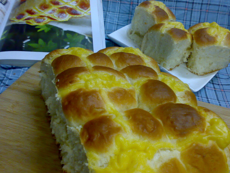 卡士薯仔包参照于圆猪猪的土豆吐司的方,果然如她所说,组织非常的柔软,土豆真的是天然柔软剂,不过在分割面团时那个粘手啊,真让人抓狂,所以一定要用手粉的。