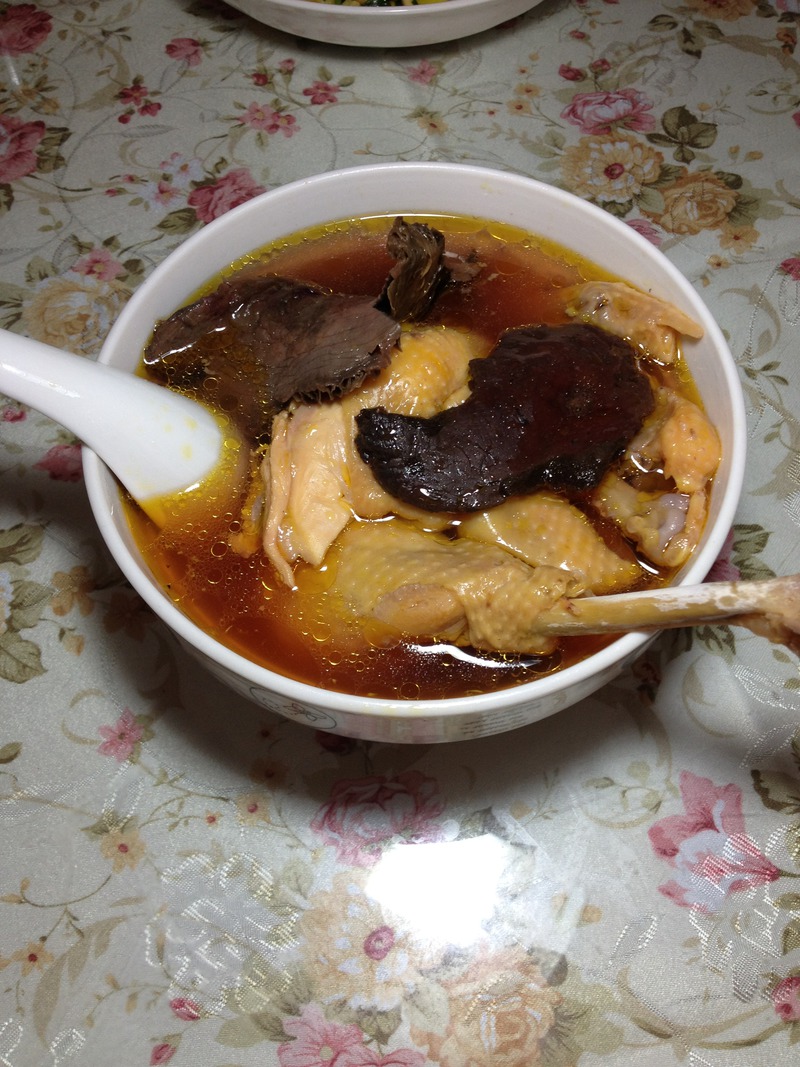 2、煲汤的时间,红菇也不宜煲的时间过久,一般用沙锅炖的话,等鸡汤快熟时,提前十分钟放下去就可以了,我这用高压锅,时间还没掌握好,颜色已经不那么红了。